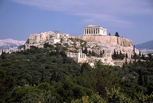 מראה כללי של האקרופוליס באתונה מצד דרום-מערב. רואים את הפרופיליאה, מקדש אתנה-ניקה, הפראתנון וחלק מהארכתיאון. כמו כן נראה במורד הדרומי האודיאון של הרודס אטיקוס והסטואה של אומנס. המכלול כולו נבנה בין השנים 447- 406 לפנה"ס.