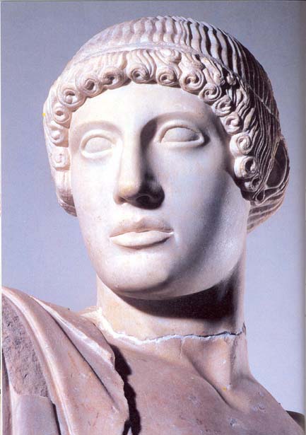 ראש של אפולו, מתוך הסצינה "המלחמה בין הלאפיתים לקנטאורים" בגמלון המערבי במקדש זאוס באולימפיה, 465 - 457 לפנה"ס בערך. כיום נמצא במוזיאון באולימפיה.