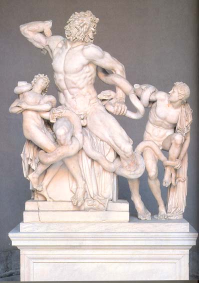 "לאוקון ובניו", שיש, כנראה פרי יצירתם של Hagesandros, Athenodoros and Polydoros of Rhodes, 175- 150 לפנה"ס בערך, מוזיאון Pio Clementino , הוואתיקן, רומא.