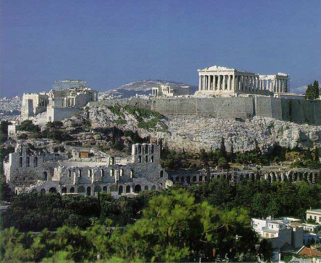 מראה כללי של האקרופוליס באתונה מצד דרום-מערב. רואים את הפרופיליאה, מקדש אתנה-ניקה, הפראתנון וחלק מהארכתיאון. כמו כן נראה במורד הדרומי האודיאון של הרודס אטיקוס והסטואה של אומנס. המכלול כולו נבנה בין השנים 447- 406 לפנה"ס.
